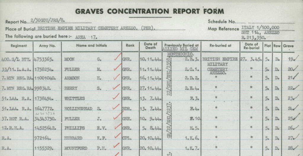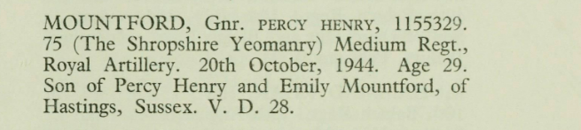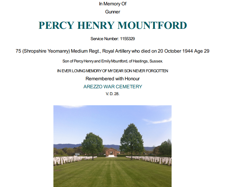 It seems that Samuel may have had an on off relationship with his wife Ethel during the 1930s as he is living at Hampstead in 1930, away in 1931 then 1934 and 1935 he is with his wife and also with Emily on the records! From 1936 onwards he is with Emily but I don’t know for how long after the 1939 register. On 24 February 1941 Emily’s Mother Eliza died leaving her money, £380 (equivalent to about £20,000 today)to her widowed daughter Emily. I believe Emily must have moved down to Hastings after this and may have used the money to buy a house there. She was certainly living in Hastings in 1944 when World War two claimed her son Percy Henry who had joined the Shropshire Regiment as a Gunner. The regiment was serving in Italy when Percy was tragically killed on the 20 October 1944, he was just 29. The records below at the time of his death show Emily as living in Hastings, Sussex.