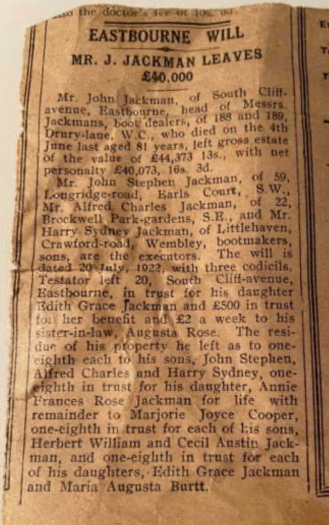 The youngest brother/sibling Cecil Austin Jackman, who was Dr Clive Cecil Jackman’s father, was a beneficiary to his brother John Stephen Jackman’s will in 1952 above but not to his father’s in 1928 below. John Jnr left his money to three of his sons, not the two youngest, the three eldest surviving sons only. One of the brothers Percy Leonard Jackman was killed in WW1 (1886-1915).
