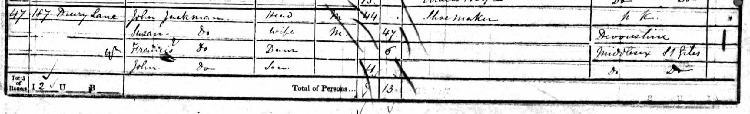 1841. As you can see below there was no Jackman family living at 187 Drury Lane because I did wonder if they had taken over an existing business for their Shoemaker/Footwear company when they moved here. Then that would have explained the surname change. Although there is a Shoemaker there in 1841. It is William Shadbolt and his family.