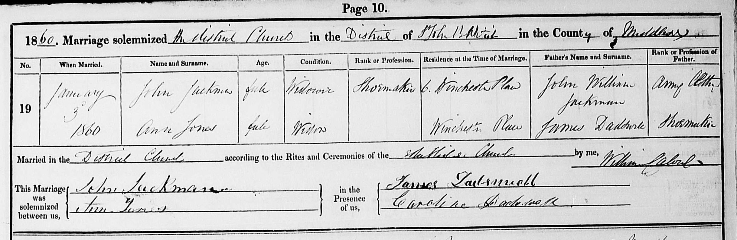 1871. After his son John left Boarding School, he also became a Shoemaker/Manufacturer like his father, he married Ann Bushell on 21 June 1870 at St John the Baptist, Kentish Town, Camden, England stating he was John Jackman. His father signed as a witness John Jackman Snr. On the 1871 census, he was living with his new wife Ann and widowed mother-in-law at 1 Malvern Cottage, Kentish Town describing himself as a Boot and Shoe Manufacturer. Father John on the 1871 census was still living at 189 Drury Lane and described himself as a Shoemaker. He had his daughter and a granddaughter called Ada living with him, was this 11-year-old girl Frances’s illegitimate daughter?