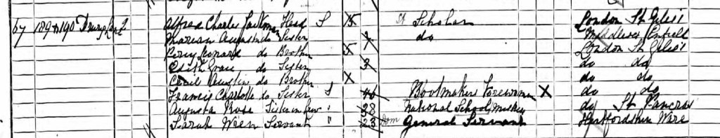 John Jackman Jnr’s sister Frances Charlotte, who never married, was the Bootmaker’s Forewoman, so she and Augusta Rose were single ladies in charge of the remaining children of the family, the youngest was just a year old. Alfred Charles even though only 15 is described as Head of the household as he was the eldest male.