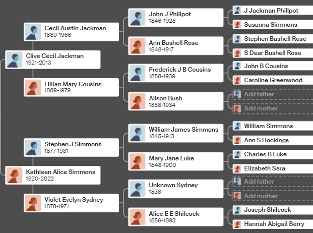 The third little mystery is that I am unable to find out who the Ancestors are of Cecil Austin Jackman’s wife Lillian Mary Cousins. Lillian’s father was Frederick John Benjamin Cousins and her mother was Allison Bush there the mystery lies as I am unable to find a birth or any family details about Allison Bush