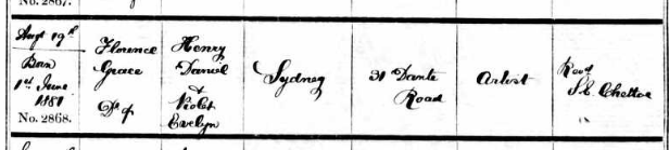 To add to this particular mystery I came across this record above while looking through Baptism records, it’s definitely the correct Florence Grace but the parents? Father is an Artist, surname of Sydney, a fictitious name? and the mother has the eldest daughter’s name Violet Evelyn (who was 3 years old), at this time John Whitfield Harland‘s wife was still living so was Henry Daniel Sydney his pseudonym. At the time of the 1881 census, there were no matching people living at 31 Dante Road, nor the Pub next door at 29. In the 1881 census, Alice Elizabeth Evelyn Shilcock lived at 37 Dante Road, so it was close to 31. Alice lived with her widowed mother and siblings and her first born daughter Violet.