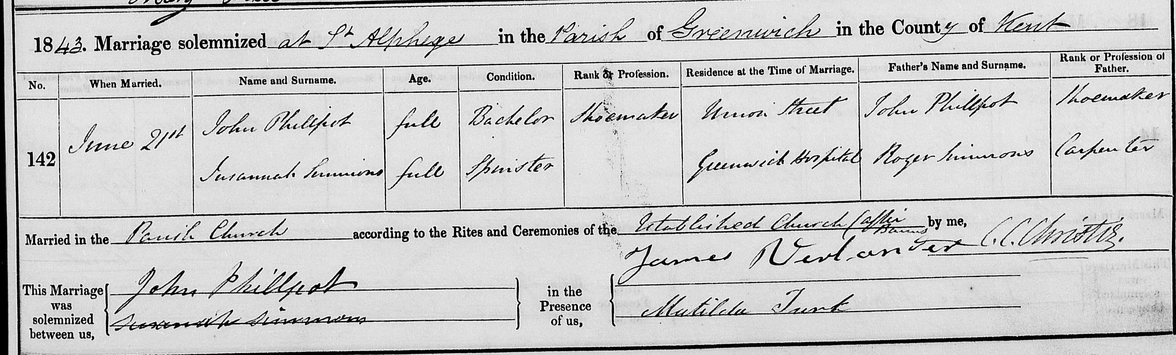 Above are Clive and Kathleen’s Parents, Grandparents and a few Great Grandparents too. As with most families, little mysteries pop up while you are researching. The first one is concerning the Great Grandfather, top-row John (Jackman) Philpot. John was born about 1807 and he married Susanna/Susan Simmons on 21 Jun 1843 at St Alphege, Greenwich, Kent. At this time John was a Shoemaker as was his father John, so it says on the marriage certificate. I haven’t been able to confirm his mother at all. John and his father John were both called PHILLPOT at the time of this marriage (image below) As you can see Susannah Simmons was living at Greenwich Hospital, could she have been a nurse? No, I managed to track her down on the 1841 census while working at the Greenwich Royal Hospital for Seamen, and she was a Servant. John was living in Union Street, not Drury Lane yet, more on this later.