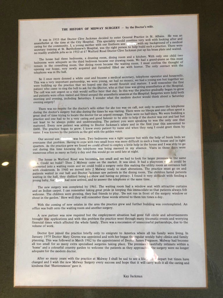 It was a sad day when he retired, but his legacy and all his hard work paid off, as the surgrey is still going strong not far from hunters moon in Midway and is now on Watford Road, Although it Is a much larger practice. I moved away from The St Albans in 1999. But I have never forgotten Dear Doctor Jackman if only all Doctors could have the same work ethics.