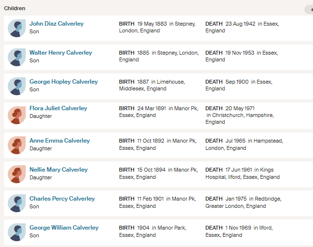 They were John Diaz Calverley, brother to Nellie, who was born on 19 May 1883 in London, he married Louisa Beatrice Heffernon (1885-1944) on 12 Sep 1908 in Essex. They had two children Robert George Calverley (1913-1978). John died on 23 Aug 1942.