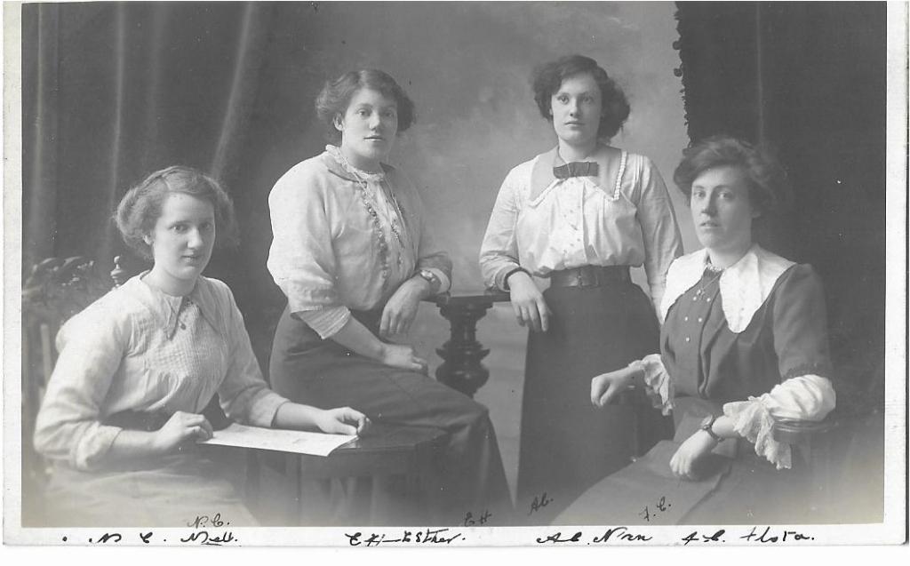 This next photo dated EASTER 1914 of the four young women is named along the bottom and the name on the far right is Flora, this is not the same Flora as the previous photo but is a sister of Nellie, born Flora Juliet Calverley 24 Mar 1891-20 May 1971.