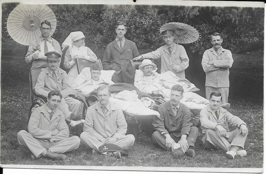 This next group photo is really interesting. It was taken by Photographers Hawksworth Wheeler, 109a Sandgate Rd and 9 Church St, Folkestone, Kent. Written on the back is Blackborough Park. Shorncliffe. June 1918. Unfortunately no names but assuming one of the family could be in the group. I do know that there was a Military Hospital at Shorncliffe Camp. The camp was operational during both WW1 and WW2 (3 miles west of Folkestone in Kent) as I had an uncle who served in WW2, who lived in married quarters there before he was sent to Europe. But would be grateful for any more information concerning this photo taken earlier.