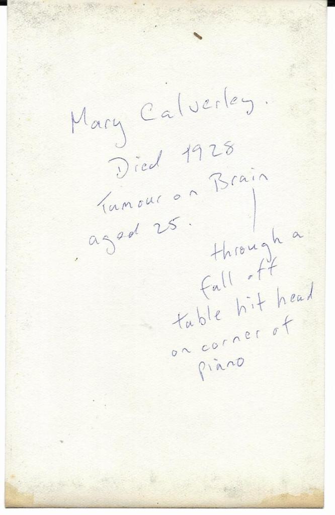 This next one is absolutely tragic and I have never ever found something like this written on the back of an old photo before. The is the same Mary Calverley that is in the centre photo above at age 12.
