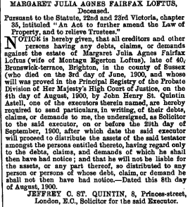 1. Self. (Number 4 in the first photo) Now I come to the writer of all these names and the most likely person to be the owner of the original Photo Album they came from, and I am as sure as I can be that I am correct. At first very frustrating, but now as a result of gradually adding more branches to the family tree, and studying the family, I do believe that ‘Self‘ was Margaret Julia Agnes Fairfax Astell, the youngest of eight children born to John Harvey Astell 1806-1887 and Annie Emelia Nisbet who married on 7 June 1853 in Wiltshire. Margaret was born at Woodbury Hall, Cambridgeshire, England in the first quarter of 1869, she married Montagu Everton Loftus on 2 Sep 1897 in Huntingdonshire. In the newspapers: “Margaret Astell, the youngest daughter of the late Mr John Astell, was united in holy matrimony with Mr Montague E. Loftus, third son of Lord Augustus Loftus. The bridegroom is Her Majesty’s Consul for Corsica. The marriage was solemnised in the pretty parish of Everton at St Mary’s Church.”