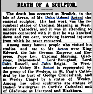 When Catherine d1886 and George d1879, passed away Marion inherited their home on the Isle of Arran and they spent lots of their time there with their children. John had a studio there, and another that he built at their home, 8 Langford Place, in London. John died on 31 October 1910 at their home ‘Ormidale’ on the Isle of Arran after being knocked down a year or so previously in London traffic, he never fully recovered.