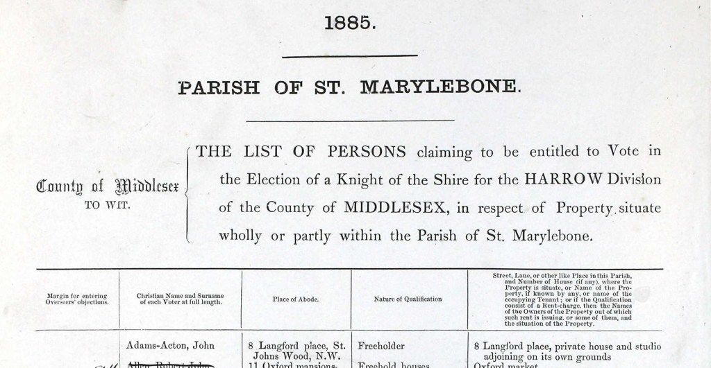 Marion and John had 7 children. In the early days of their marriage, they lived at 103 Marylebone Road (1881) They moved to 8 Langford Place, St John’s Wood (1891 and 1901) it now has a strange gothic style house on the land apparently owned by Vaness Feltz. I’m a bit puzzled as to why there is a Blue Plaque at no 14 Langford Place for John Adams Acton, saying he lived there from 1882-1906? His birth date is also incorrect on the plaque? 1831, he was born on 11 December 1830, his birth date is on his Baptism record. This is the 1885 election record describing no 8 Langford Place, St Johns Wood.