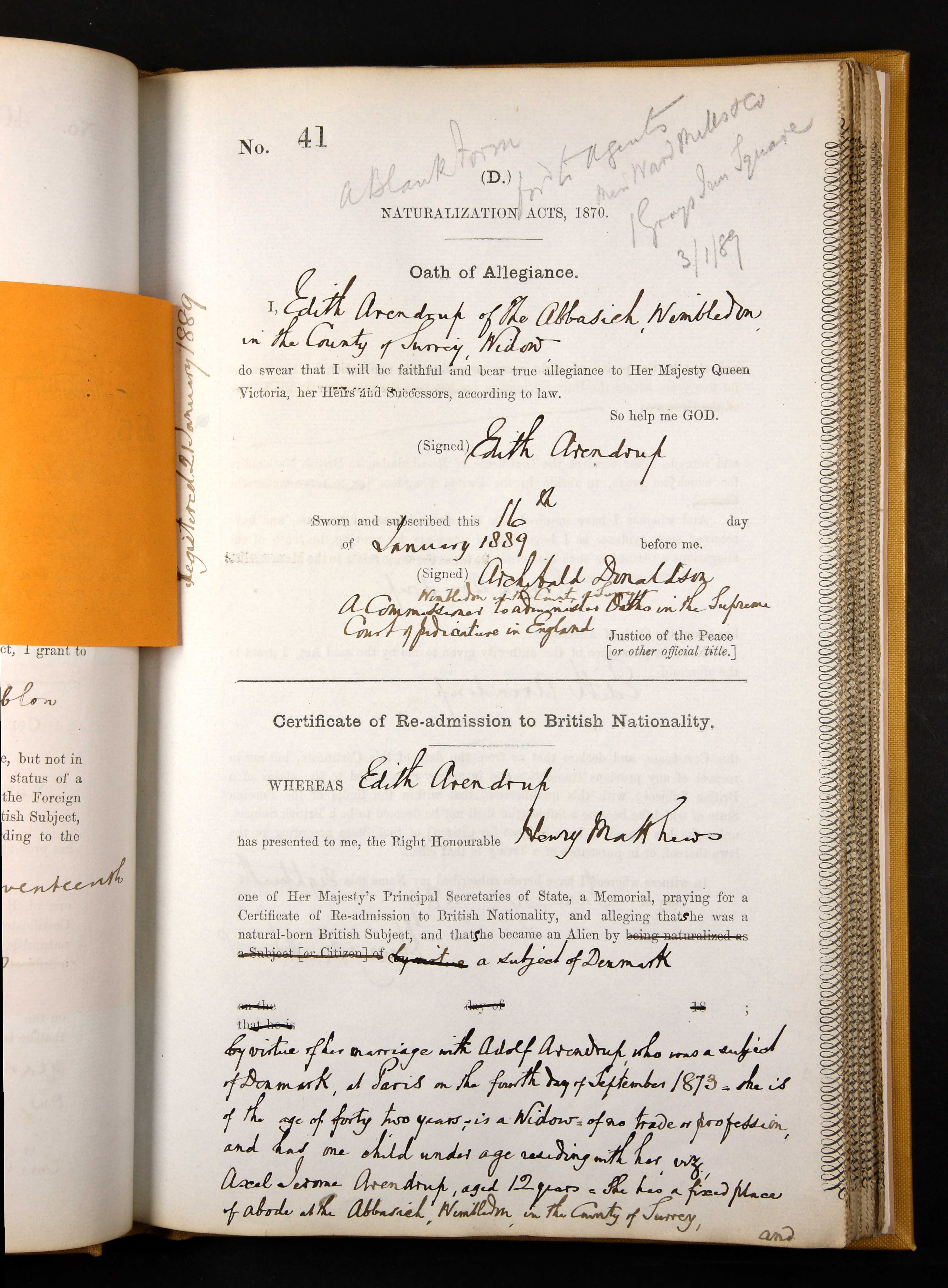 The next record below dated 16 January 1889 is a Naturalization document. By marrying Soren she had become a citizen of Denmark but now as she was on her own with her son she wanted to be a British Subject again. She was an independent wealthy woman so she would have had no problem, in the 1891 census she had her own home in Wimbledon living with her son and a parlour maid, a cook, a kitchen maid and a gardener/coachman.