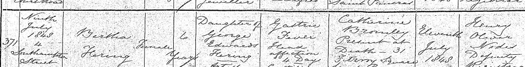 When young Bertha Hering tragically died on 9 July 1848 aged just 6, Catherine and George must have been distraught. She was born and died at no 4 Southampton Street. Cause of death, Gastric Fever, gland infection 4 days. Catherine Bromley was present at her death, she gives her address as 31 Fitzroy Square, Paddington.