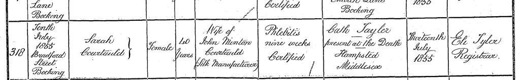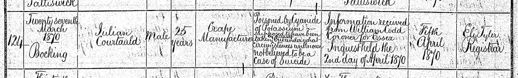 Sarah and John Minton Courtauld had 2 children, a son Julian b25 Mar 1844-27 Mar 1870. He was just 26 when he died, how sad, was it suicide? The inquest thought not?