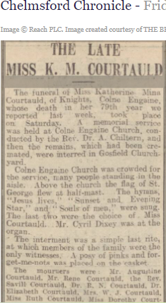 Mrs Courtauld was the second wife of Mr John Courtauld. The deceased lady was left a widow shortly after her marriage to Mr Courtauld who died about 16 years ago. She was the daughter of the late Mr Bromley and her first husband was the late Mr Preston. She leaves no children…..