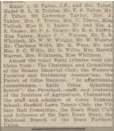 A long time prior to her death the deceased lady expressed a wish to have her body cremated and her ashes buried at Gosfield Churchyard. Her body was taken to Woking and then Friday it was cremated and on Saturday morning a stone casket containing the ashes arrived back at Bridge House in the charge of an official from Woking…..there was also a bit of a hoo ha because the Vicar where Elizabeth was buried would not allow a Non-Conformist service to be held at the graveside, many of the Bromley family through the generations were non-conformists (Elizabeth’s ashes were buried with John Minton Courtauld and Her sister Sarah, John’s first wife) he had the right to not allow a dissenting service to be held but the Lord’s Prayer was said and the Benediction. His objections were noted that it was to prevent a president from being established in regard to non-parochial dissenters” ……..”Previous to the burial of Elizabeth’s ashes the family had held a funeral service in the drawing room of Bridge House, it was of simple character by the pastor of the Unitarian Chapel, High Garret, Mr R H Fuller”.