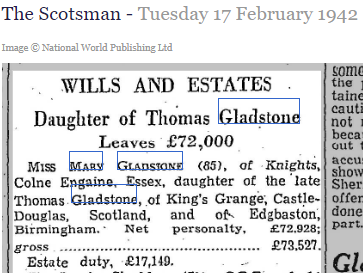 When Mary Gladstone died on 15 Nov 1941 there were no grand reports in the newspapers of her death and funeral but I did find this when notification of her will was published in February 1942. I do hope someone placed a beautiful posy on her casket.