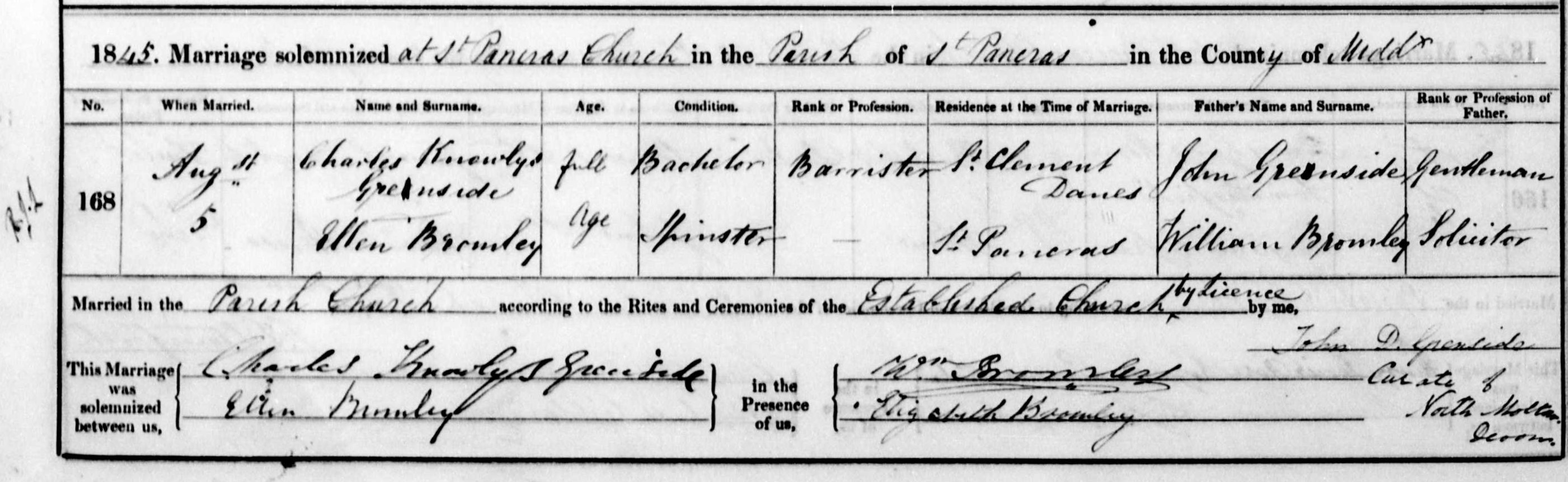 Their next child was Ellen Bromley born on 25 July 1822 in Bloomsbury, Middlesex. On 5 August 1845, she married Charles Knowlys Grenside (1813-1902) at the Old Church, Saint Pancras in London. Ellen died aged 61 in September 1883 in Erpingham, Norfolk, England.