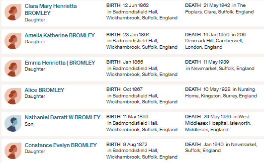 Following this move, Joseph and Amelia’s son Nathaniel Warner Bromley (1822-1896) took up residence at Badmondisfield with his wife Henrietta Martha (Winter) (1828-1914) and their family, they had 5 daughters and one son.