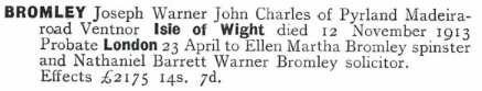 Mr H. H. Gain, Assistant Official Receiver, attended, and, on examination by him, the debtor said that he was admitted as a solicitor in 1896. For about four years afterwards, he was a junior partner in a firm of solicitors. In 1900 he began to practise on his own account at the Wool Exchange, London, where he remained for a few years and then removed to Finsbury House, Blomfield Street, London, where he practised until recently. Conveyancing in general family work had formed his main business, and for some years he had a junior partner, who was called up for military service in 1914, In 1917 the partnership ended. As a result of the war he lost several clerks, and for part of that period was himself engaged in a Government department, Before the war he made about £2,000 a year, but the events mentioned caused his practice to fall off considerably, In fact, it had never recovered, and latterly it had declined owing to his being engaged in too many enterprises to enable him to give proper attention to it. The debtor considered that during the last three years, his average net profits had been about £7OO a year. 1t was on his father’s death in 1896 that he inherited the Badmondisfield Hall estate, comprising about 300 acres and including a mansion, arm lands and cottages. He expended considerable sums on the property and in acquiring and repairing other adjoining farms and cottage property. Over a number of years, he had increased the extent of his holding to some one thousand acres. This was for investment purposes, and he raised the necessary finance on a mortgage of the properties. He let the estate in farms, allotments, or cottage holdings, but in recent years he had taken over and farmed two of the properties himself, cultivating black currants and osiers (shoots of willow). These proved profitable, especially the osiers. However, in general, farming operations, he had sustained losses. Agriculture had been, the debtor said, at its worst state. He had made the estate his hobby to the detriment of his practice and his financial gain. In fact, he had given too much time to Suffolk. With a view to the development of the estate, he conceived the idea of running in conjunction a nursery business. In April 1921, he registered a private company called Worth Park Nurseries, Limited, with a nominal capital of £5OO. The Company rented part of his Suffolk estate and also land at Worth Park, Sussex. Ultimately, he became the sole shareholder, although the shares were now worthless, Late in 1923 or early 1924 a Debenture issue of £lO,OOO was authorised. He also financed the Company to a very considerable extent, but it proved a failure and in August last a receiver and manager were appointed. He anticipated that his loss in connection with the Company would be at least £7,000, The debtor attributed his failure to heavy expenditure on the upkeep and maintenance of his Suffolk estate and loss on farming operations, to loss on financing Worth Park Nurseries Ltd, to embarking on commercial enterprises to the detriment of his practice and to decline of his practice owing to lack of full attention; and to heavy payments for interest and life insurance premiums. In answer to counsel representing creditors, the debtor added that his downfall was not in any way due to the Hatry collapse, nor had he ever made any such allegation. As a matter of fact, Mr Hatry had treated him most generously regarding cash and expressed appreciation for his services. The examination was adjourned until March 9th“. Sentenced to three years in Jail. Name: Nathaniel Barrett Warner Bromley. Trial Age: 62. Record Type: Criminal Trial. Birth Date: 1869. Trial Date: 15 Oct 1931. Criminal Date: 1931. Occupation: Solicitor. Charge: Fraudulent Conversion, Sentence 3 years. Nathaniel died on 29 May 1936 in West Middlesex Hospital, Isleworth, Middlesex. Probate £5 only. To Frederick Bradbury Winter, Solicitor. Most likely one of his mother’s family.