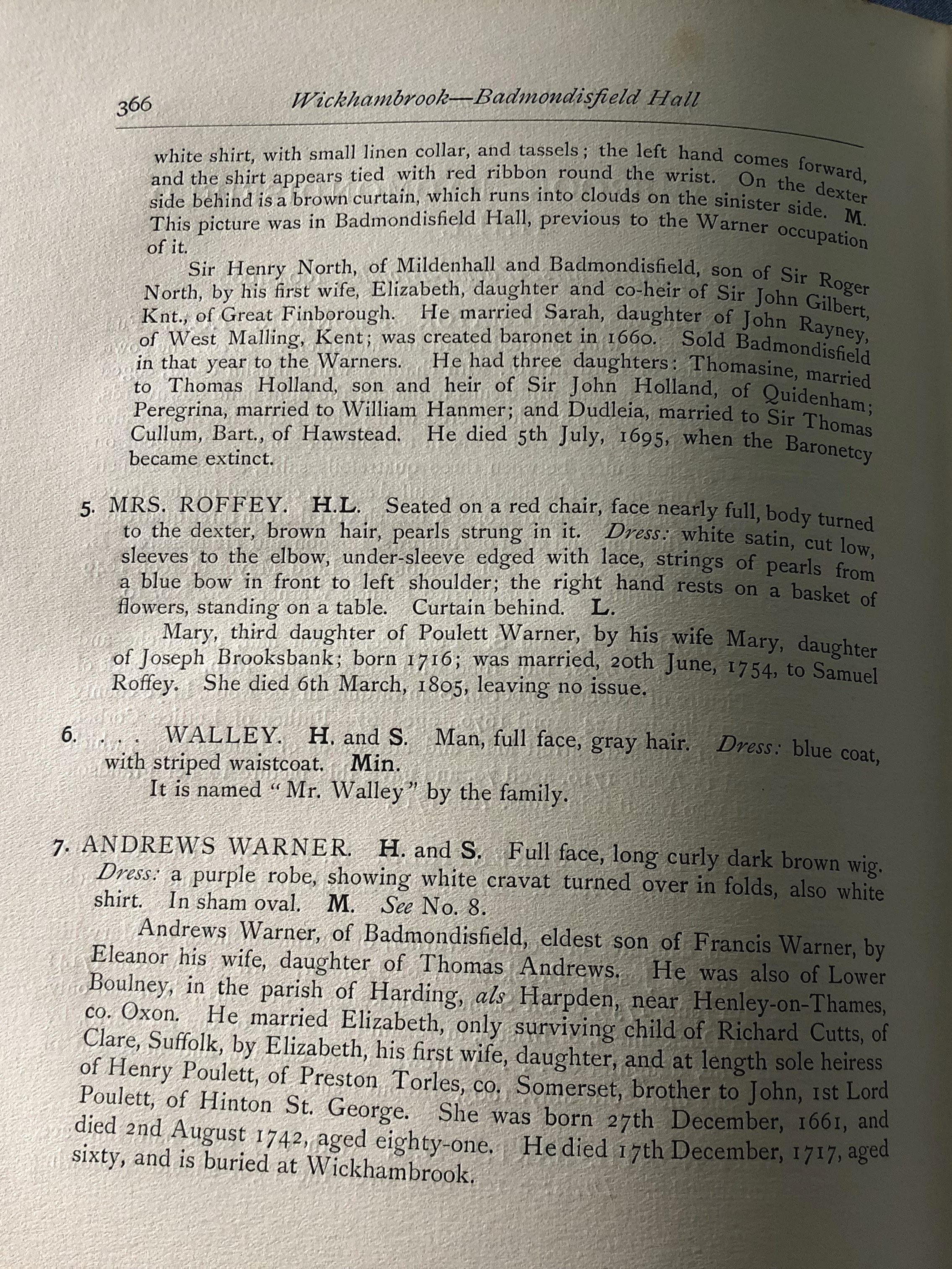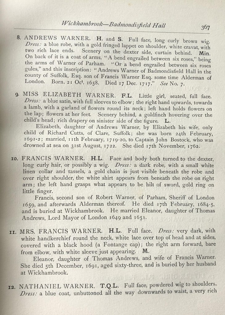 What I have tried to do, purely because I have become fascinated by the place, is to build up a timeline of Badmondisfield and who owned the hall and estate pre-1932 and beyond where I can. By looking at everything online, especially newspaper articles, going through mentions of the Hall and Estate and the people in the family, I have also been searching in Baptisms, Marriages and Deaths, and Wills to fill in lots of gaps and the Internet Archive website showing the text of some books was really helpful for building up the family tree, one book was ‘The Manors of Suffolk, The Hundreds of Lothingland and Mutford, Plomesgate, and Risbridge’, giving me lots of information about who owned what and when. I also found an absolute gem there of the text of ‘Portraits in Suffolk Houses by Edmund Farrer, published in 1908.’ I managed to find one on the internet and so I’ve sent off for it (11 Aug 23). I’m really excited for it to arrive and to be able to ‘see’ some of the people I’ve been researching. It will delay this blog a little but worth the wait I hope! (15 Aug 23) So the book wasn’t what I’d hoped for as the majority of the portraits were just described and not shown, so disappointing, but never mind it had one owner with his portrait Sir Henry North.