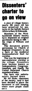 1986. 8 Aug. The Dissenters Charter for Badmondisfield Hall is to go on view. It is held by Suffolk Archives and is dated 1695.