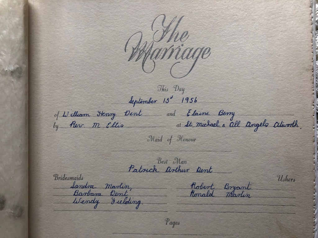 Last week I received a large package from a lovely friend and it included not only lots of old photos from one family, an exercise book with some certificates and lots of family history from another family but also this wonderful Wedding Album belonging to this couple who became Mr and Mrs Dent on 15 September 1956.