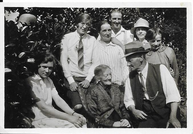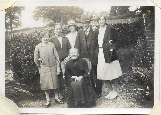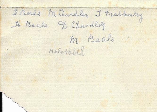 Mehitable died in 1933 so this photo obviously pre-dates that. The older man with the hat has got to be her husband Henry Beale, he died in 1938. S. Beale is Sarah Beale who never married. M. Chandler is Mary Letitia Chandler (1910-1978) T. Mabberley is Theresa (Beale) My only thought for D. Chandler is that it could be Edith Sarah Doreen Chandler (1908-1999) could she have been known as Doreen? Both the younger Chandler girls are Theresa‘s children.