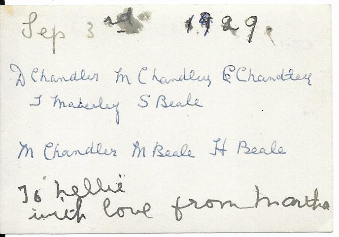 Dated 3 Sep 1929 and as the next photo we see the Beale’s and Chandlers with Mother and Father Beale at the front. Martha was Henry and Mehitabel’s eldest child.