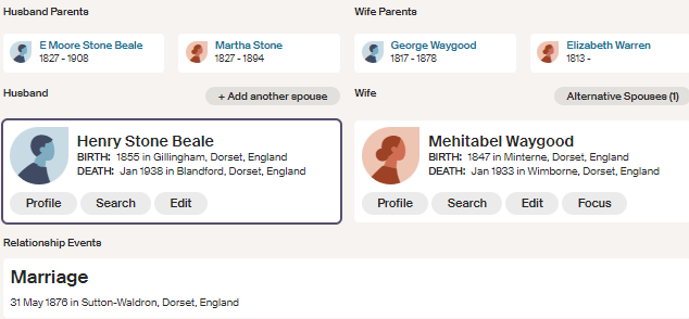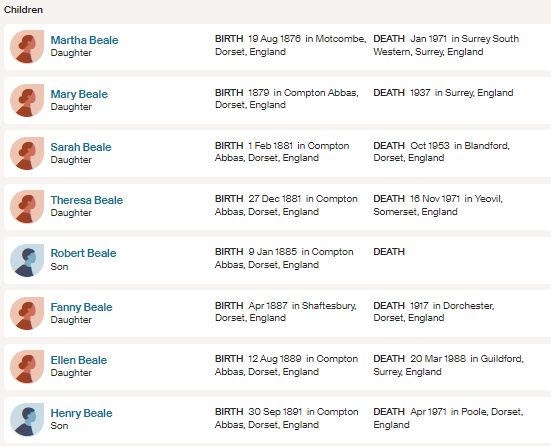The family group sheet for the Beale Family is rather confusing in the records as they sometimes used Martha’s maiden name with Beale as their Surname, also Martha’s husband Edwin I think could have been born a Moore and not a Beale, but it would take too long for me to research this and you would need all the certificates to prove all the links, so I shall leave that for a family member to research.