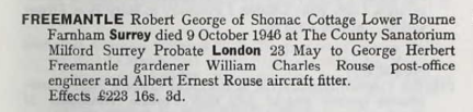 Their only child, Robert George Freemantle was born on 24 November 1915 in Farnham, Surrey. Robert was living in Surrey in 1937 at the time of his mother’s death. Robert died on 9 October 1946 in Surrey at the young age of 30.