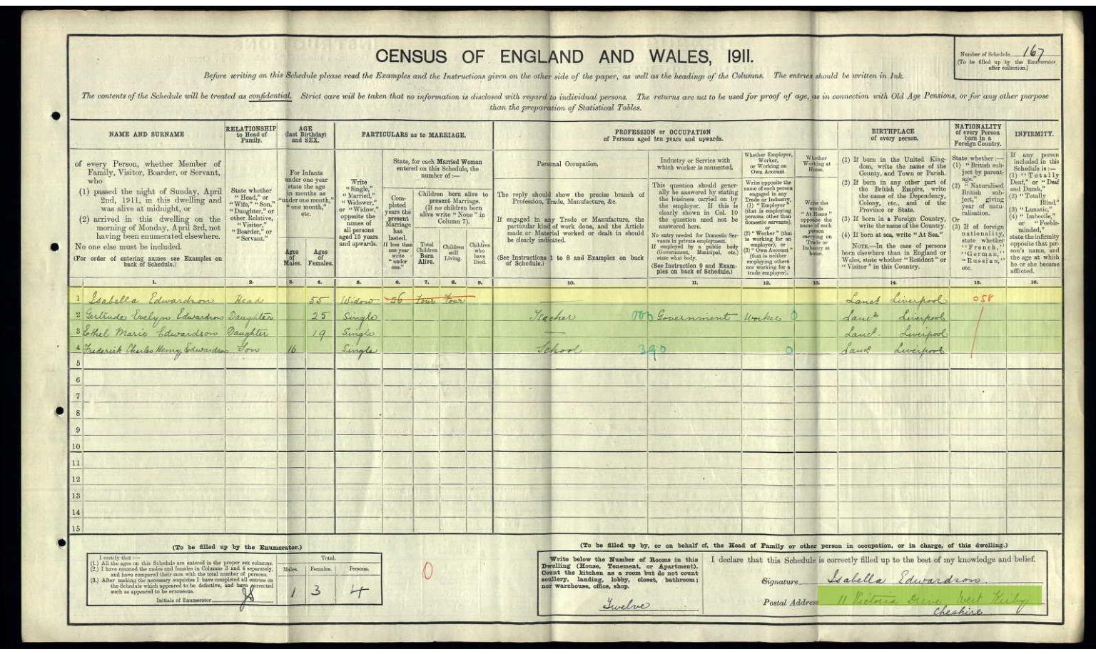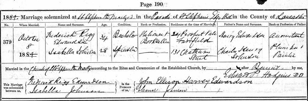 In the previous census of 1871, he was Assistant Clerk for the Justice of the Peace for the Borough ( I think…it’s not very clear) 1891 he was married with two daughters and one on the way and his occupation was a Bookseller Manager (Limited Company) 1901 Frederick and Isabella now have two more children, another daughter and a son. They had also moved to Moreton Cum Lingham, Cheshire. He is now an Accountant. Sadly by the time of the 1911 census though Frederick had died aged just 60 in the September quarter of 1910. Isabella in 1911 is living at 11 Victoria Drive with three of her children still at home.