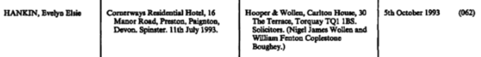 Both the photos above and below are of Evelyn Elsie Hankin a first cousin to Beatrice and sister of Ena and Harold, Evelyn was born on 24 August 1902, her father was William Hankin and her mother Florence Day. She never married and obviously loved acting, she died on 11 July 1993 in Torbay, Devon, at the age of 90. I also found a record in the London Gazette dated 1971(Free to search) Hooper & Wollen, Carlton House, Torquay, Devon, Solicitors. (Richard John Wollen, Nigel James Wollen and Evelyn Elsie Hankin) Not often you get this lucky to find a lady’s occupation, she was a Solicitor in Torquay. Then this record below from Find My Past after her death in 1993.