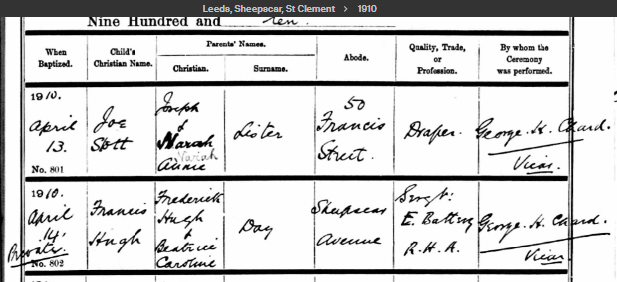 As you can see Beatrice had an older brother Francis Hugh Day who died at just 12 days old, the family held a Private Baptism for him, and little Francis sadly died later the same day.