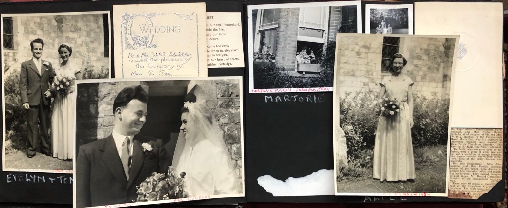 On the left above we have a sister of Evelyn, her name is Patricia Mary Stubbles and she wed William James Tonkins, they married in the third quarter of 1954 and Evelyn and another sister Alice (on the right page at the bottom) were Bridesmaids. Both of the sisters were married at Hale Parish Church (The Church Of St John The Evangelist) in Farnham, Surrey. Also on the right is Marjorie March looking out the window of her Farnham office. Most of the adults in this Album are friends and colleagues from the Farnham Hospital or Family Members.