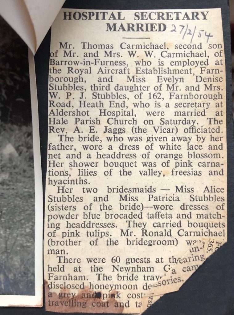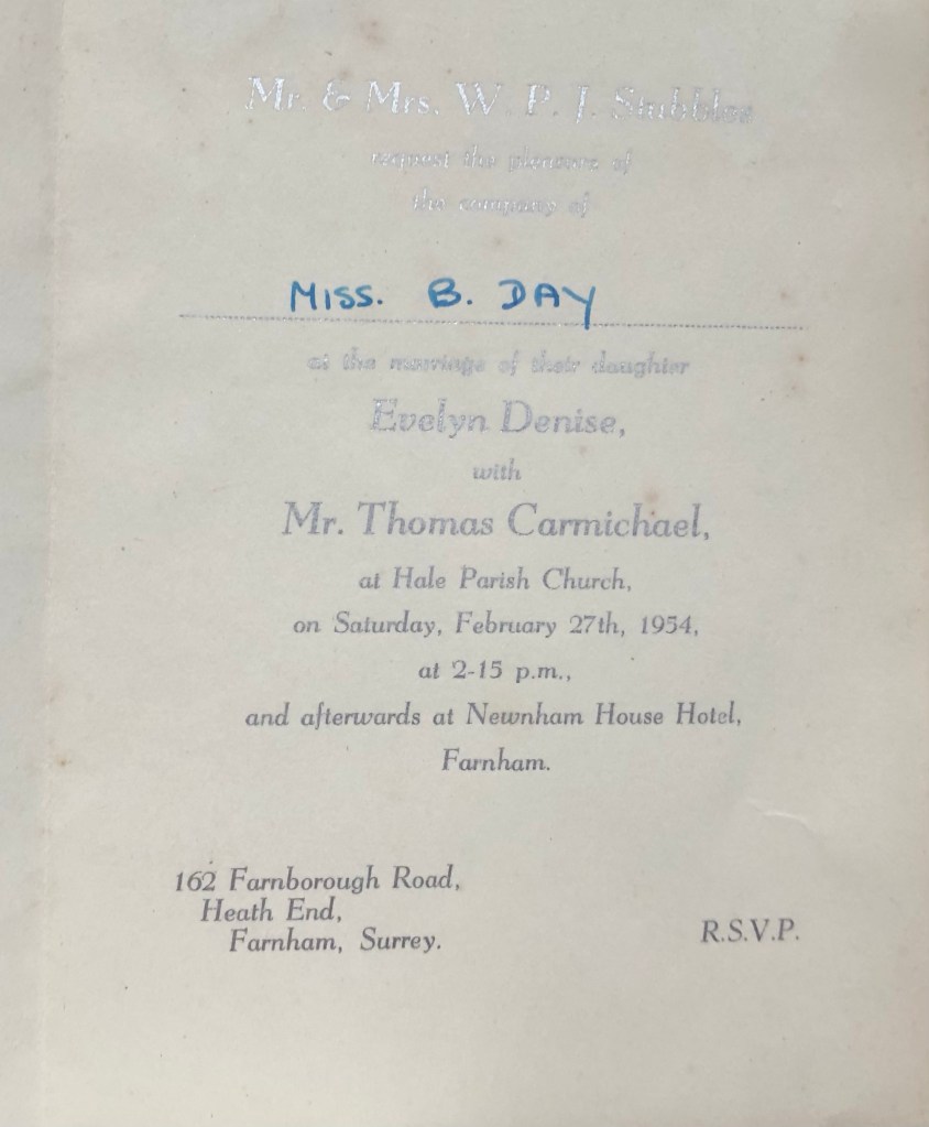 On the right page, it says Jean Bates and Evelyn, bottom pic. She matches with the Bride. Evelyn D Stubbles marriage to Thomas Carmichael. Marriage quarter 1. Volume 5G. Page number 1670. Marriage year 1954. District Surrey South Western. (The wedding date was 7 February 1954).