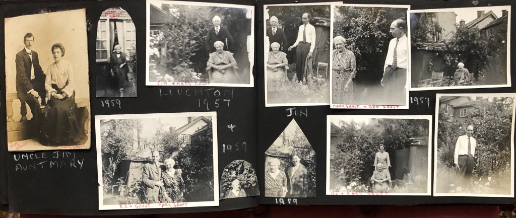 - Another page is Uncle Jim and Aunt Mary. Photos marked ‘Loughton 1957 and 1959 and one says Jim and Mary GROUT.