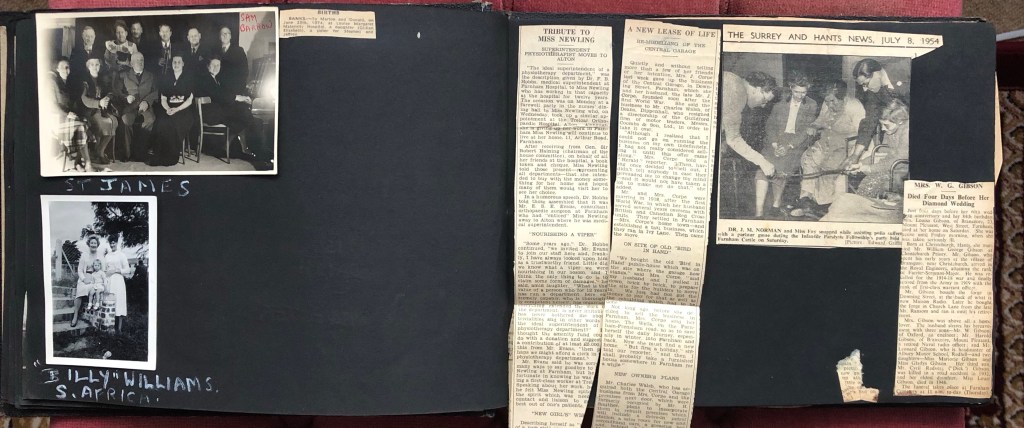 - There are many references to Farnham Hospital, one photo says ‘My Office’ right at the front of the building on the ground floor, a Matron? This lady was definitely a Nurse of some kind. There are also many Newspaper clippings stuck in with news of colleagues, Doctors and Nurses.