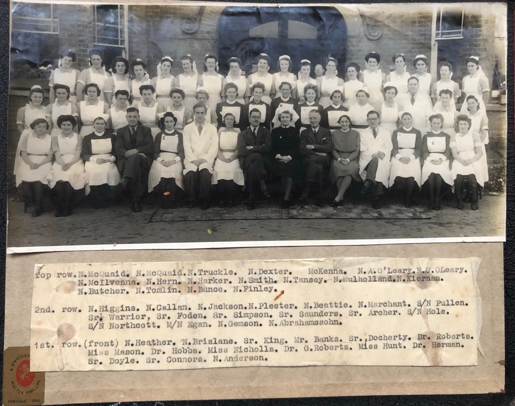 Others mentioned on the back front left to right are Dr Thomas General Surgeon. Sir Robert Haining. Lord Holder. Lady Haining. Pathological Chairman Dr Hobbs.