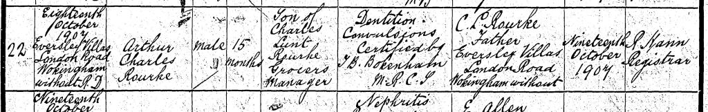 So I researched this and found that the couple Charles Lunt Rourke 1876-1959 and Emily May (Yeomans) 1879-1963 had married in 1905. Then in the 3rd quarter of 1907 their son Arthur Charles Rourke was born but he died aged just 15 months, the cause of death on the digital death certificate was ‘Dentition Convulsions‘ I’ve not come across that before, but it seems it was more common than you would think, various teething problems were listed as ‘Cause of Death’ in the past.