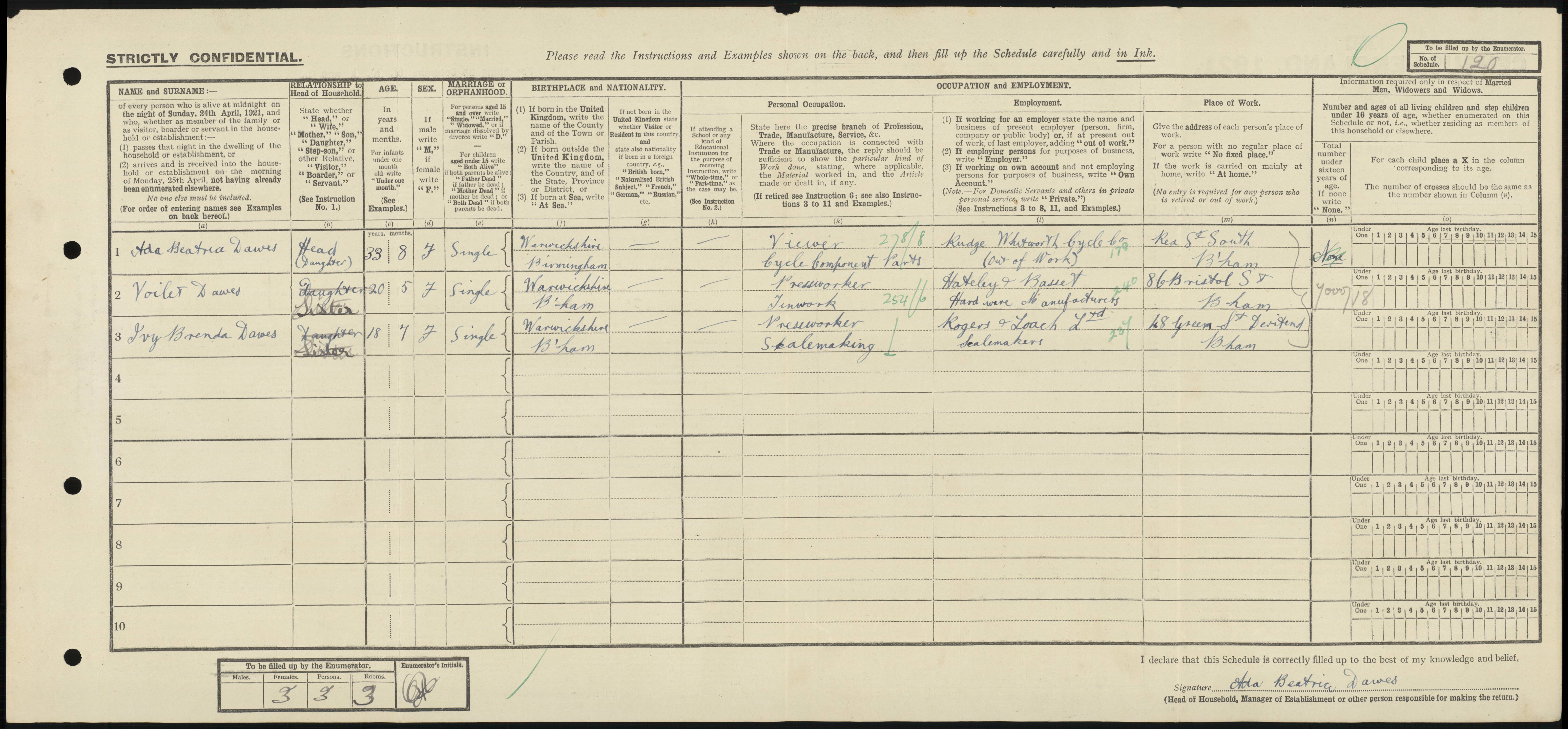 So I started a small family tree with details of Ivy and Albert’s marriage. Ivy Brenda Dawes married Albert Frederick Baggott on the 21 July 1928 at the Holy Trinity, Parish Church of Bordesley, Birmingham, England. Albert was a Toolmaker and Ivy was an Assembler.