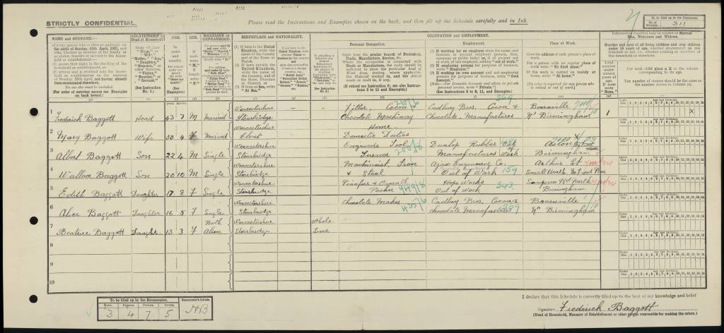 I couldn’t help but notice on this 1921 census above for the Baggott family that Father Frederick Baggott and one of Albert’s sisters, Alice, were working for the famous Chocolate Factory in Bournville, Birmingham, Cadbury’s. The family lived at 79 Henley Street, about 5 miles from the Chocolate Factory. Frederick was a fitter for the Cocoa and Chocolate Machinery and Alice was a Chocolate Maker, imagine having that job! I’m not sure I could work with Chocolate all day every day haha.