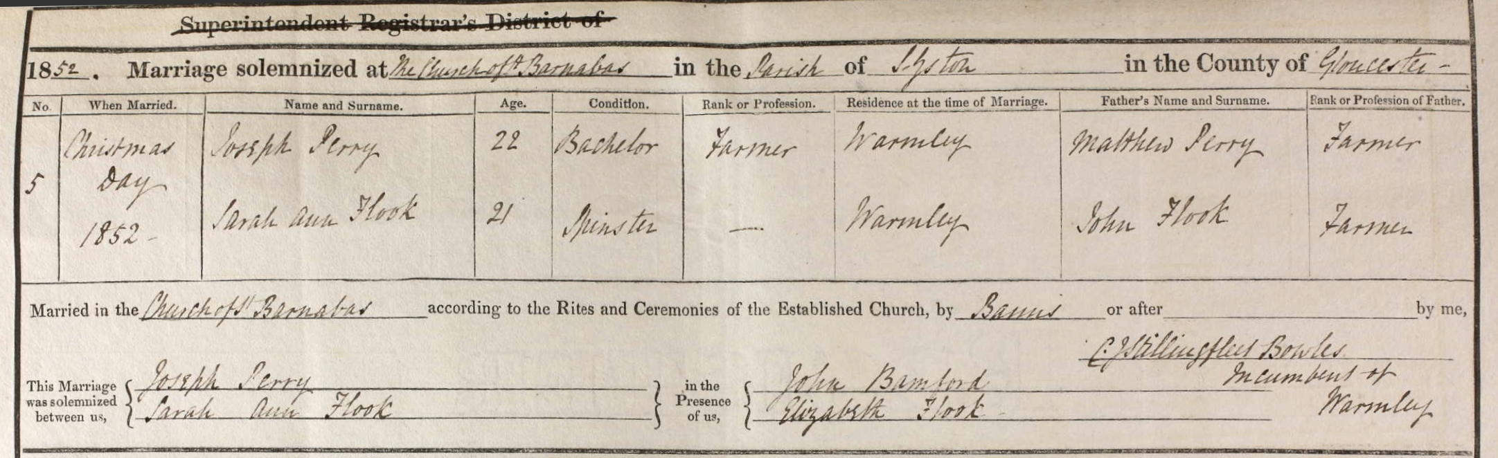 I started a family tree with Sarah Flook marrying Mr Perry and looked for matches in the Bristol area where the photo was taken. Looking at parish marriages for Sarah Flook marrying Perry there were just two on Find My Past, both for the same marriage when Sarah Ann Flook married Joseph Perry on Christmas Day 1852 at St Barnabus Church, Warmley, Gloucestershire (6 miles from the centre of Bristol).