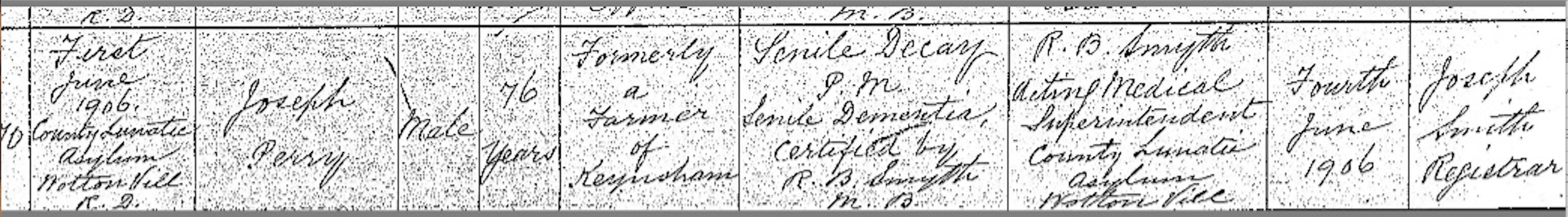 Joseph died at the County Lunatic Asylum, Wotton Hill, Gloucestershire on 1 June 1906. Cause of death senile decay, senile dementia.