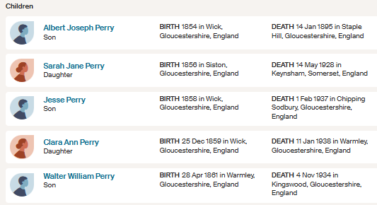 Sarah Ann’s husband Joseph Perry was a ‘Farmer of three acres’ and ‘Farm Labourer’ It seems from looking at the census records after their marriage that he suffered mentally as in 1871 he was an inmate at the workhouse described as a lunatic. 1881 he was home with his wife and two of his children, 1891 he was at home with his family living on his own means. Sarah Ann died in May 1896 of heart disease and chronic bronchitis.