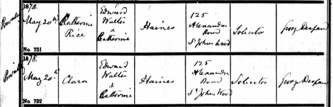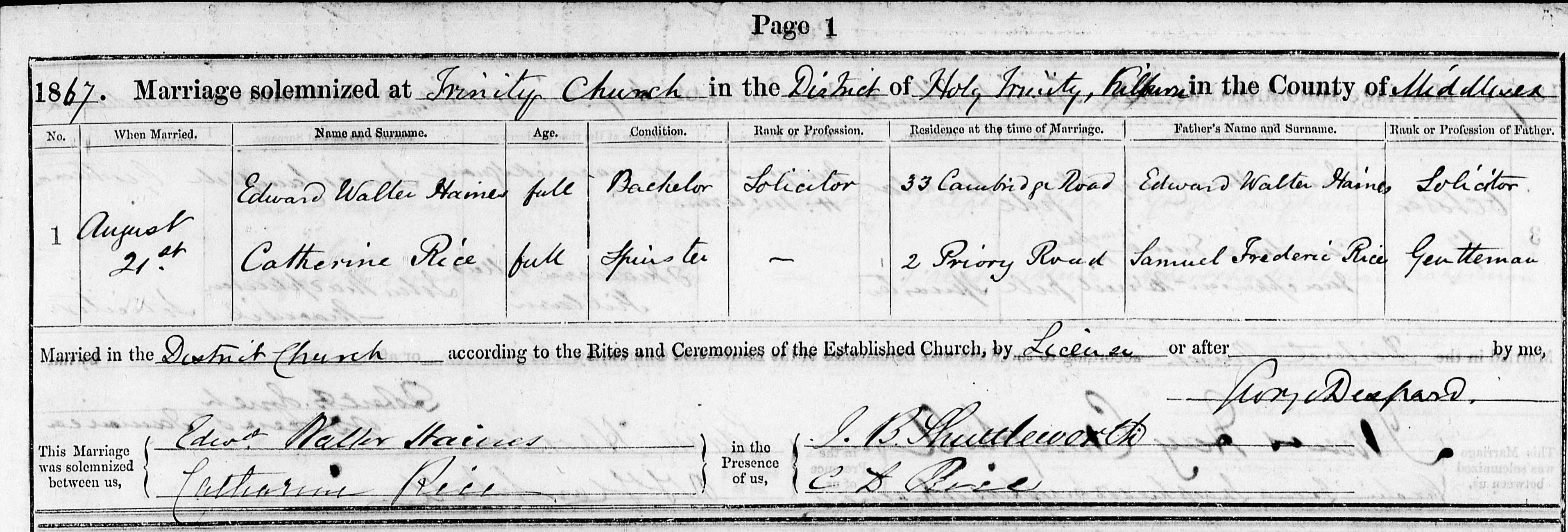 Edward Walter Haines was born on 30 September 1835 to parents Edward and Eliza. He married Catherine Rice on 21 August 1867 in the Holy Trinity Church, Kilburn. Edward had followed in his father’s footsteps becoming a Solicitor. The couple had two daughters during their marriage, firstly Catherine Rice Haines born in June 1868 then a second daughter Frances Clara Haines born in September 1870. He died on 13 October 1917 aged 82 years.