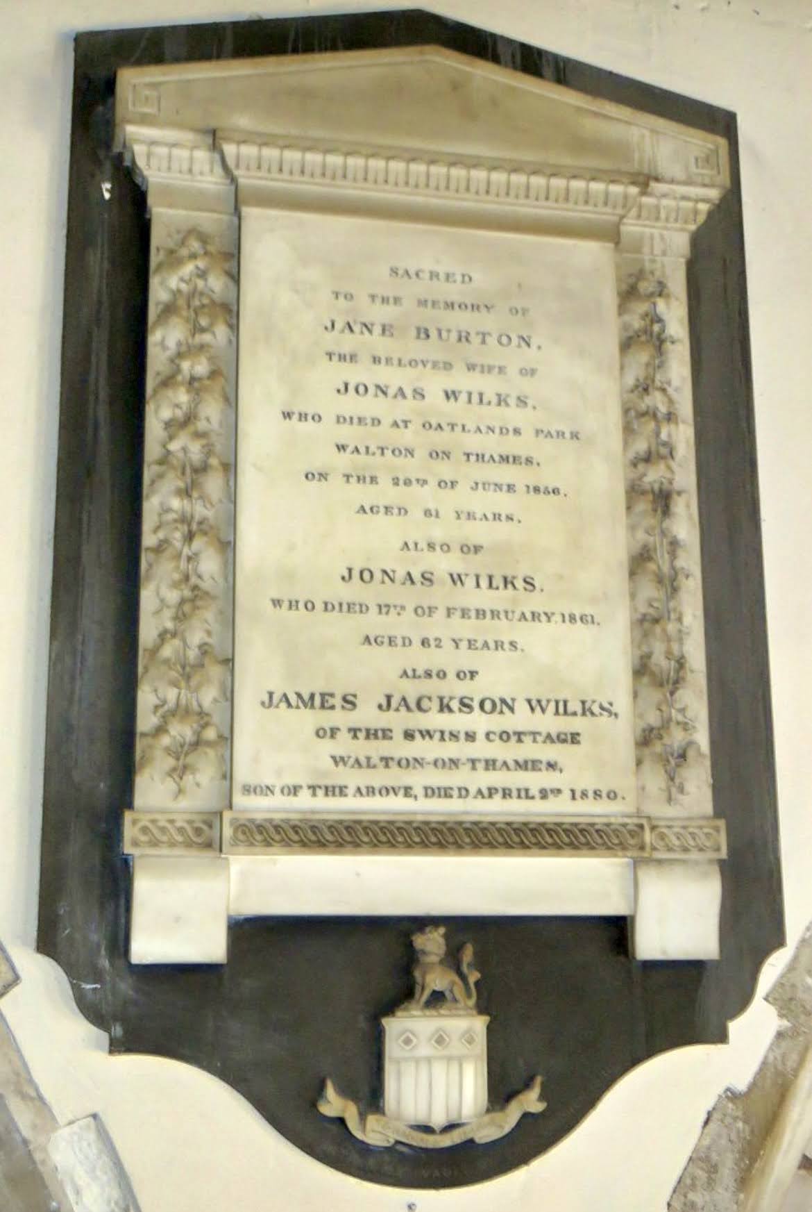 “On 20th June 1854, James Jackson Wilks, elder son of Jonas Wilks of Oatlands Park married Louisa Harriett, eldest daughter of James Watts Peppercorne, Esq. of Oatlands House at Weybridge Church“.