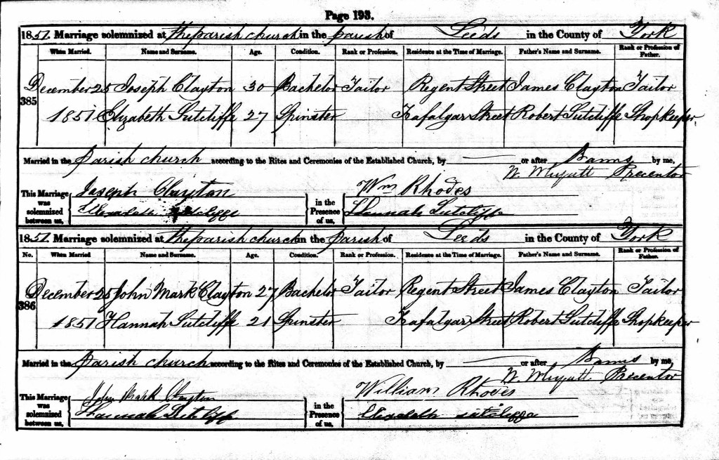 Clara was one of nine children that I’ve found so far born to John Mark Clayton and his wife Hannah Sutcliffe. When I was looking for their marriage, I came across the fact that the couple must have had a double wedding on Christmas Day 1857 in the parish church in Leeds, Yorkshire, see image below, two brothers married two sisters.