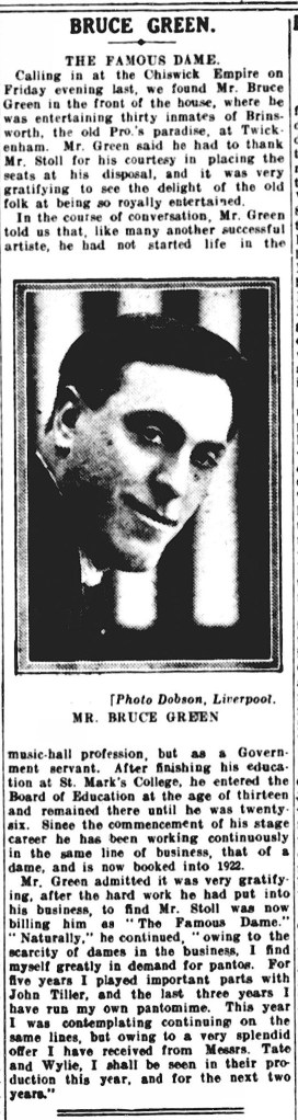 JOSEPH BREWSTER HAMILTON GREEN (stage name BRUCE GREEN) was a comedian born in 1876. He enjoyed a long and successful career as a pantomime and music hall artiste playing a ‘dame’.